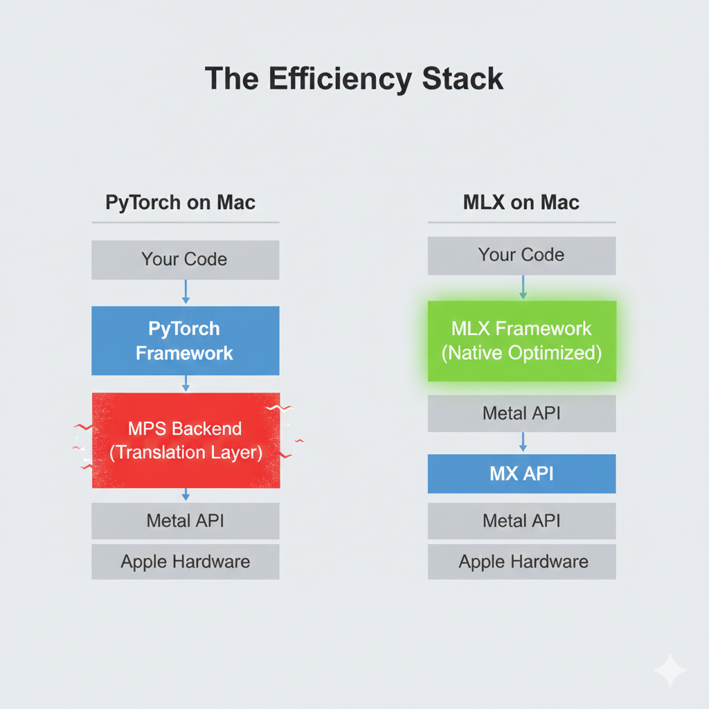 MLX is designed by researchers who intimately understand how the M-series chips work. It doesn’t need a translation layer because it speaks the native language of the hardware.